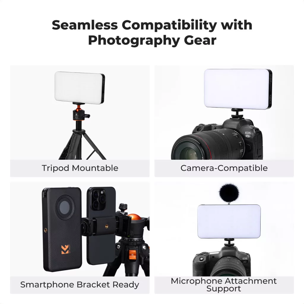 A 1/4"-os menetes csatlakozók felül és alul, valamint a mellékelt cold shoe adapter révén a lámpa rögzíthető állványra, gimbalra, fényképezőgépre vagy más kiegészítőkre, így minden felvételi helyzethez rugalmasan igazodik.