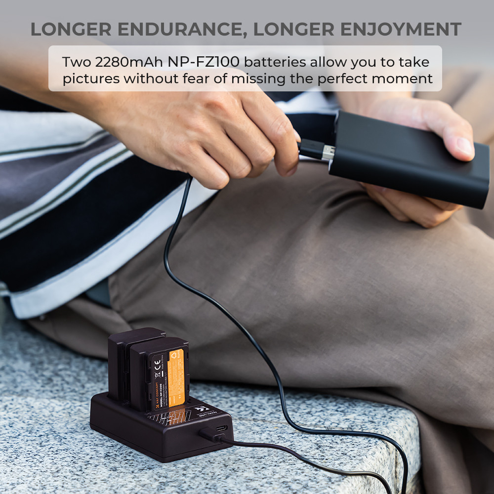 Praktikus: A töltő készlet tartalmaz 2 db 7,4V 2280mAh Sony NP-FZ100 csereakkumulátort és mikro USB/Type C dupla interfészű töltőt, támogatja a fali, otthoni töltést, illetve az autós töltési lehetőséget. Kompakt méretének és praktikus kialakításának köszönhetően könnyedén hordozható.