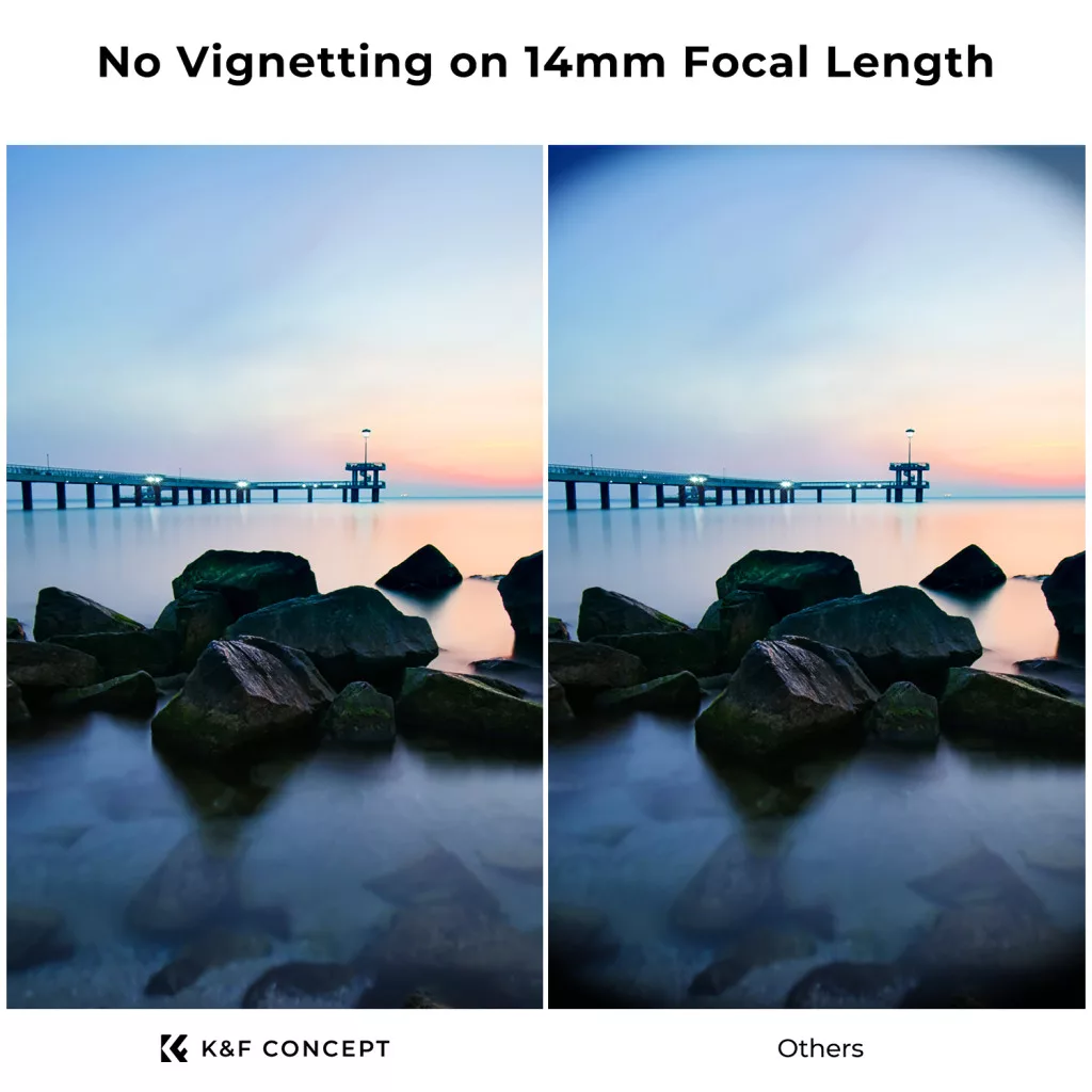 • Prémium kivitel: A többrétegű bevonat és a precíziós polírozás csökkenti a visszaverődő fényt és növeli a szűrő tartósságát, a vékony, mindössze 7,4 mm vastagság keret pedig minimalizálja a vignettálás kockázatát még széles látószögű objektívek használatakor is.