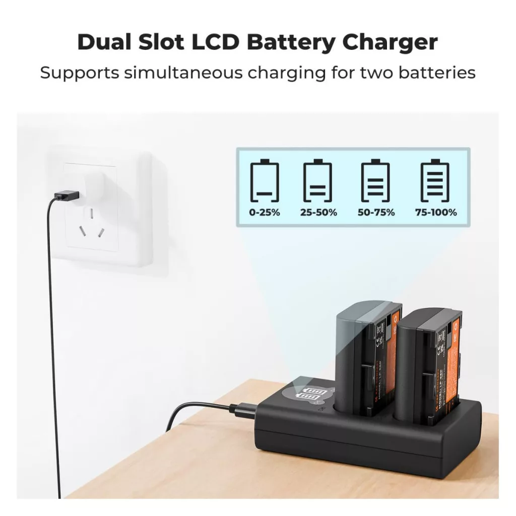 A K&F Concept LP-E6P akkumulátorkészlet praktikus és hatékony megoldást kínál a Canon felhasználók számára. A szett két darab, nagy kapacitású (2400mAh) LP-E6P akkumulátort és egy korszerű, dupla férőhelyes USB-C töltőt tartalmaz LCD kijelzővel, amely valós időben mutatja az egyes akkumulátorok töltöttségi szintjét.